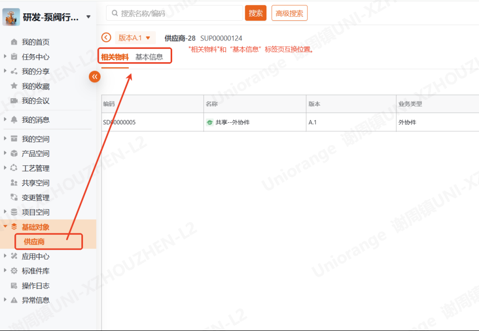“供应商”详情页,“相关物料”和“基本信息”位置互换,进入供应商详情页时默认展示“相关物料”页签内容。