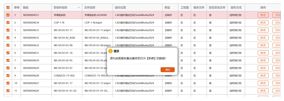 SW插件:优化提示页面高度;支持批量修改业务类型;没有权限的数据,不支持勾选回传;回传的业务数据,默认填充回传位置;对于未修改的业务数据,回传时解锁不升版。