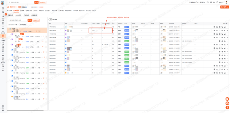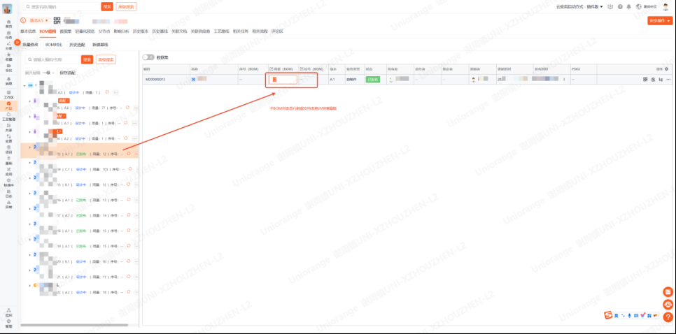 1.3 子BOM列表首条数据支持BOM属性的表格内快捷编辑,关键信息维护“一步到位”。