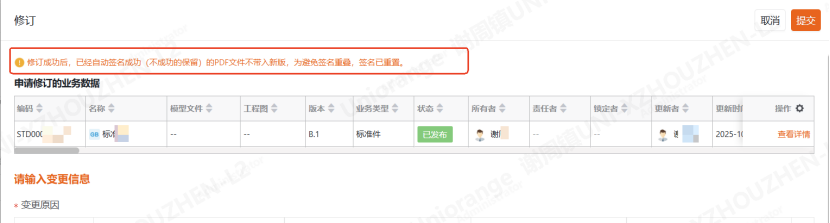 1.1 业务数据“修订”时,数据集文件在修订(升版)后,原数据集中的签名PDF继续保留且重置原有版本上的签名,文档签名退回初始状态。