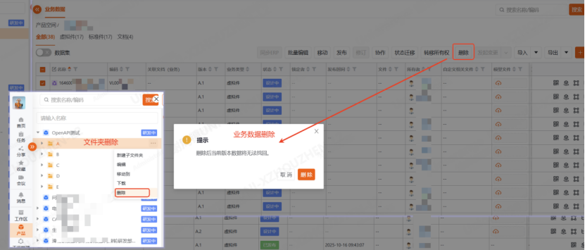 1.2 业务数据删除时只会删除未发布的版本,保留“已发布”的历史版本。产品空间文件夹删除时,内部的业务数据保留“已发布”的历史版本。