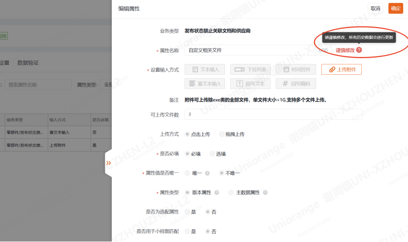 1.4 属性编辑时异步同步到历史数据,同步完成后会通过站内信通知此处操作修改的人。企业管理员在企业后台的操作日志也看到操作细节。