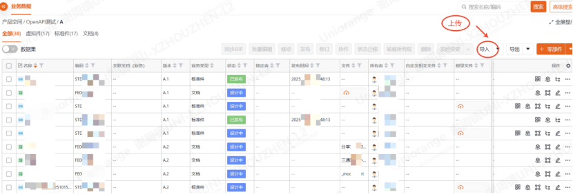 可配置相关文件列头并控制在列表上的相关列的显隐,且支持在表格上直接上传相关文件。