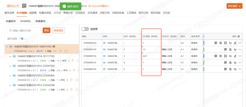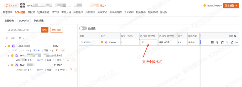 1.3 BOM属性“用量”字段兼容整数和小数。同时支持整数和小数的设置及展示。