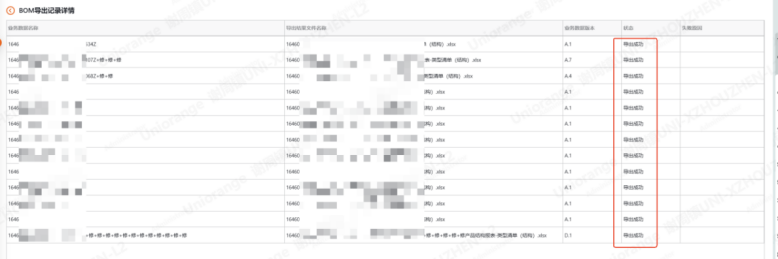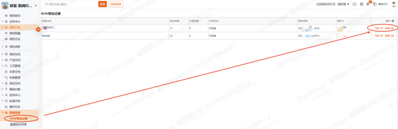 1.8 BOM导出支持单个产品空间下批量导出,异步导出后在“异常信息 - BOM导出记录”里下载导出的数据,并支持查看记录详情。