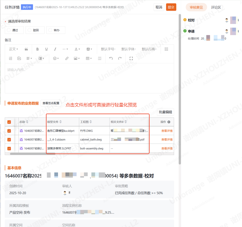 在流程审核节点中,审核者可快速对需要审核的数据进行轻量化查看(模型文件、工程图、相关文件)。提升审核准确度、提高审核效率。
