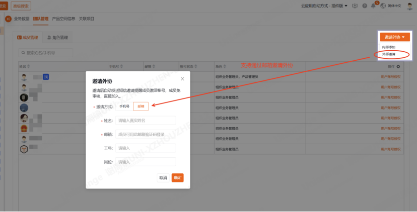 产品空间 - 团队管理,邀请威胁增加邮箱邀请。