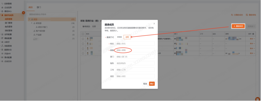 第五步:企业管理员进入组织与成员-成员管理,点击邀请成员;填写成员信息,部门与角色如有可以先行选择,亦可邀请后再分配;