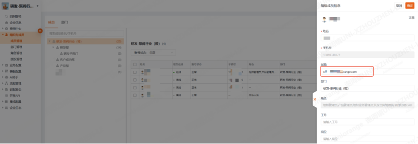 企业管理后台 - 成员管理,成员信息编辑,增加支持邮箱的编辑。