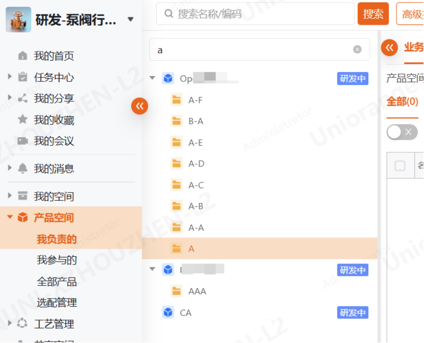 1.2 产品空间树搜索框支持模糊搜索和大小写兼容搜索产品空间以及自己文件夹名称。