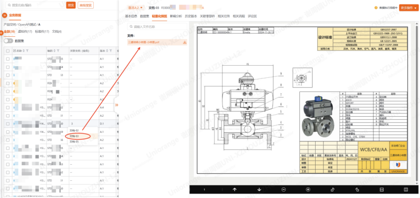 可配置“关联文档”列头并控制在列表上的相关列的显隐,有关联文档的数据会显示对应的关联文档数量,鼠标点击数量单元格,会弹出所有关联文档的名称,点击名称实时进行轻量化预览。