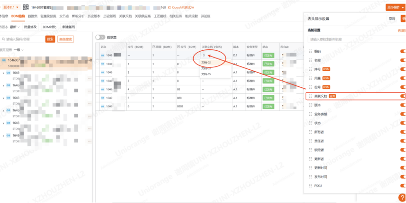 1.5 业务数据列表和BOM列表支持查看“关联文档”。
