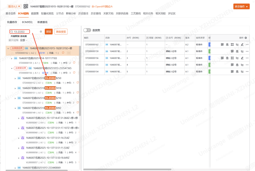 使用思维脑图方式展开影响分析数据,支持双击快速展开关系数据,提升页面易用性与可读性;支持对父节点和子节点同时协作;业务数据没有附件时,能快速上传文件,提升操作效率;新增零部件基线管理,支持重要节点的零部件BOM结构通过基线留存,满足用户对BOM更加精细化管理需求,提升产品竞争力;